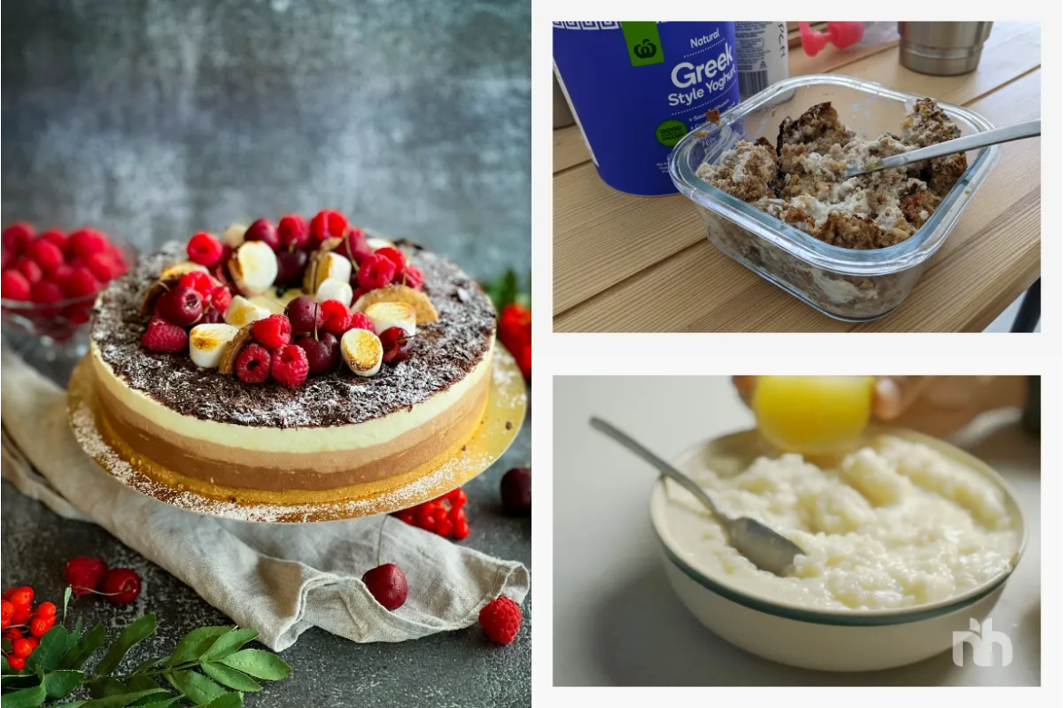 Reality (right): rice pudding (mushy rice, milk, condensed milk, lemon, eggs) or jam cake (plain flour, 2x eggs, olive oil or butter, choice of jam @ 100g). ~ $4 AUD per entire batch of 1.5 to 2 serves.