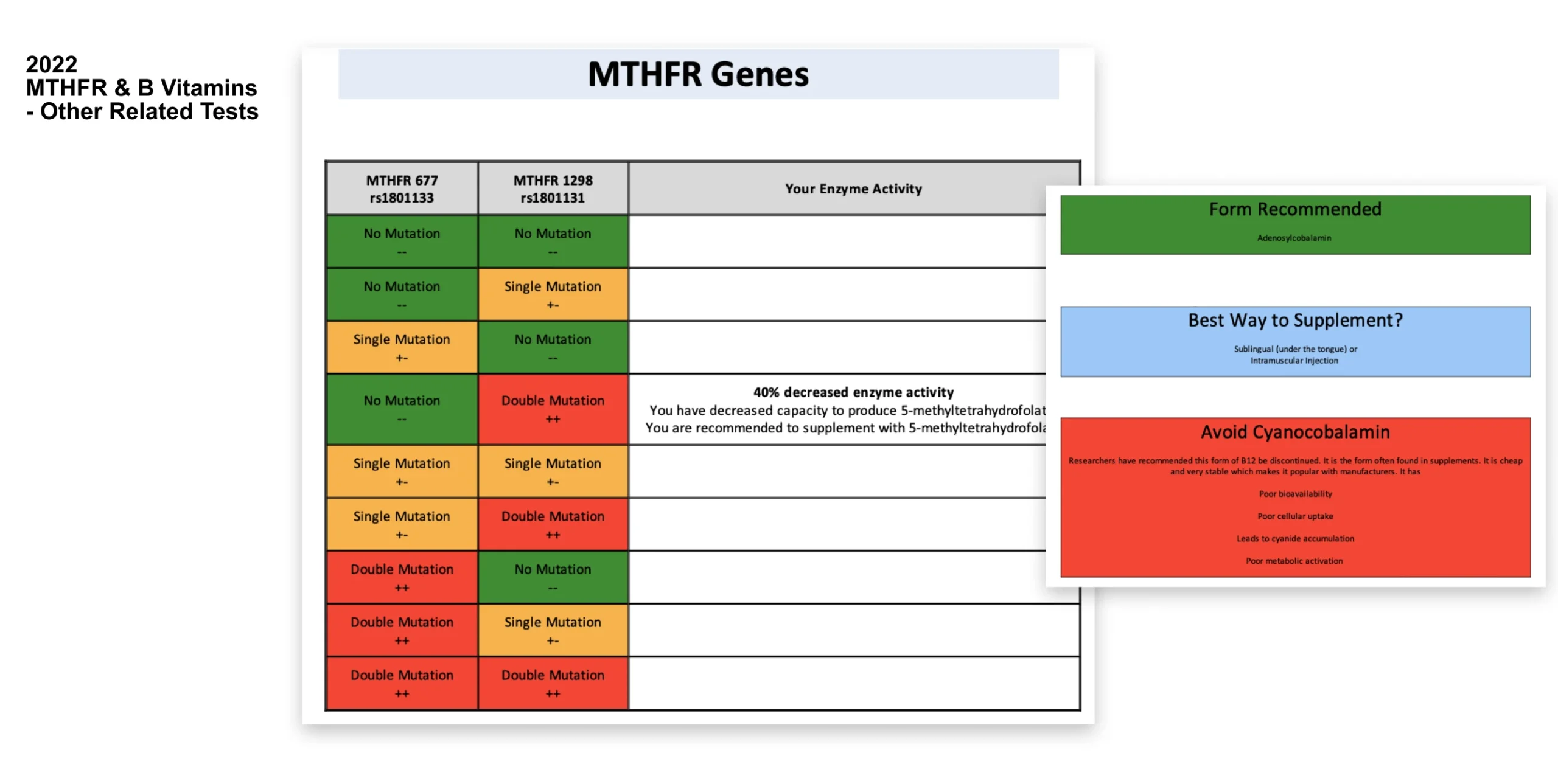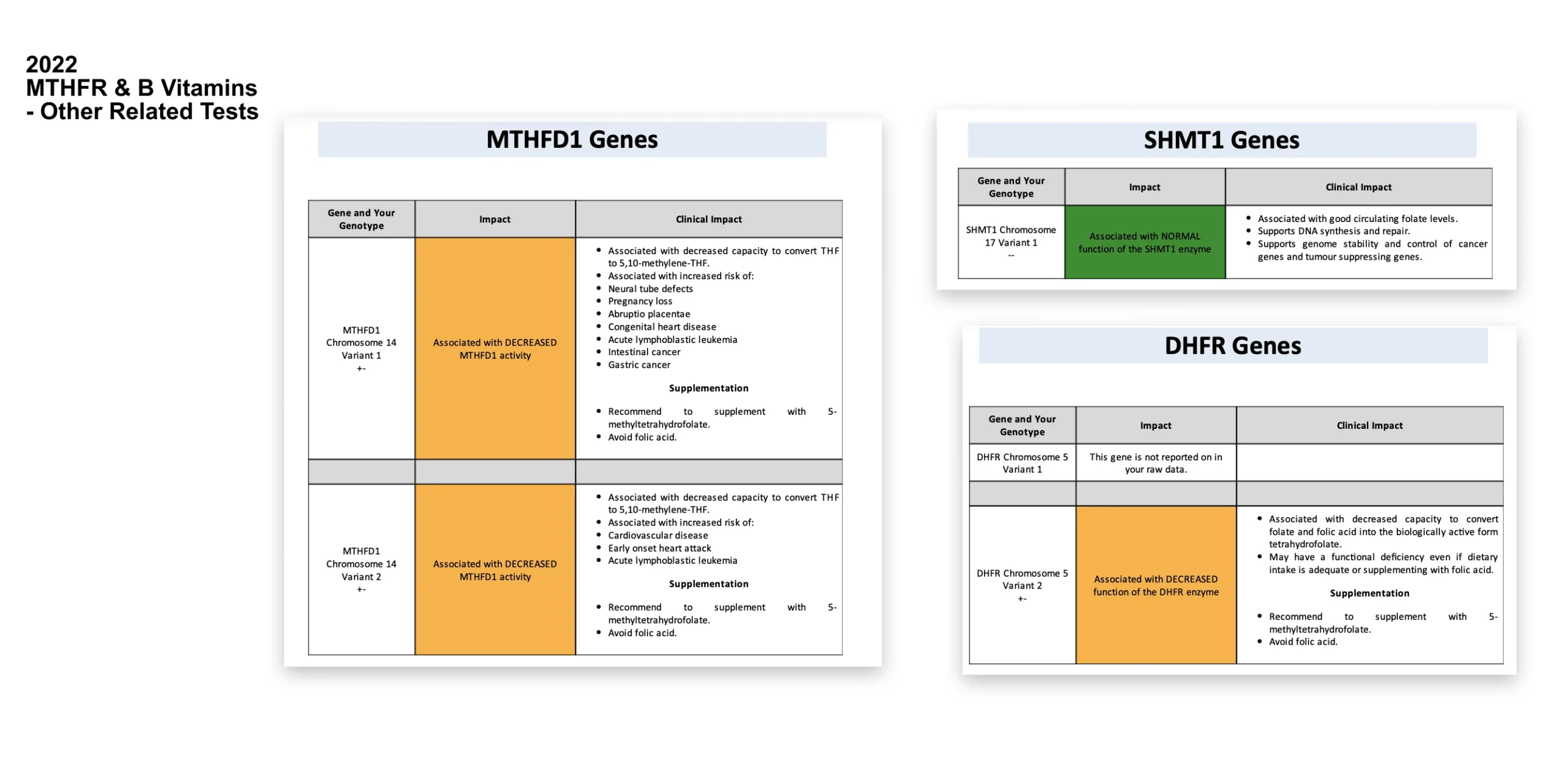 Firstly is MTHFR. My brief understanding on this is that it primarily helps convert the inactive Vitamin B9 ("Folate") to biologically active form ~ 5 methyltetrahydrofolate \. Now, a variant as either a "CT" or "TT" And my basic methylation understanding suggests - that MTHFR being primarily also the most common gene one looks for is homocysteine, which ideally should be broken down to methionine, and/or cysteine with the help of existing vitamins B6, and B12.